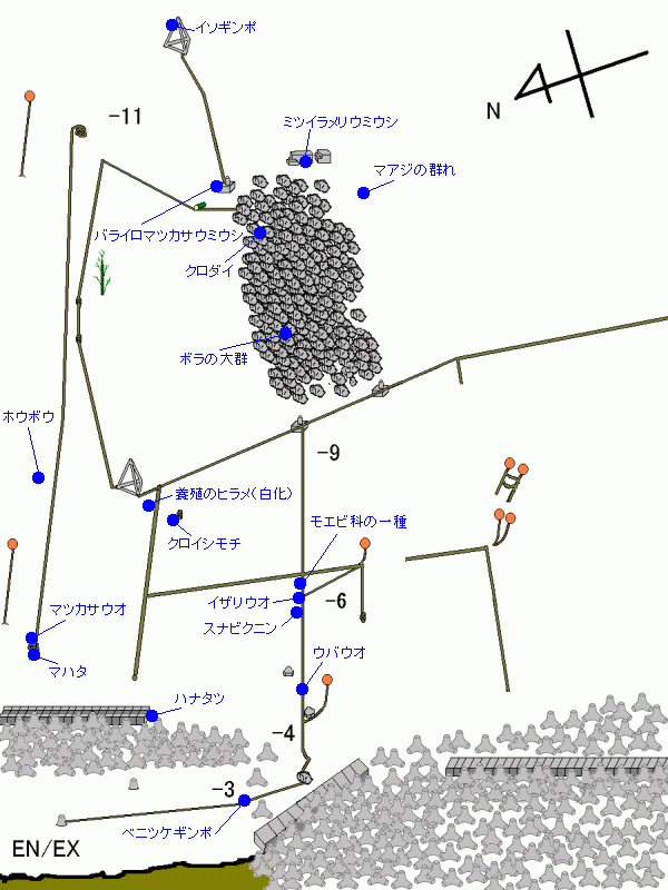 まず、エントリー口前の消波ブロックの側面でハナタツを確認。かなり動き回るらしく、1本